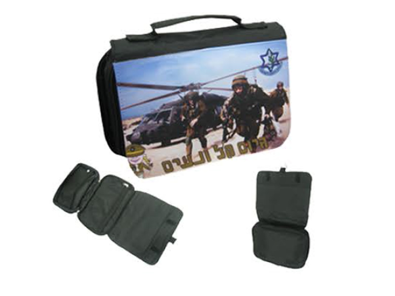 תיק לכלי רחצה בצבע שחור עם 2 תאים ומתלה מברזל